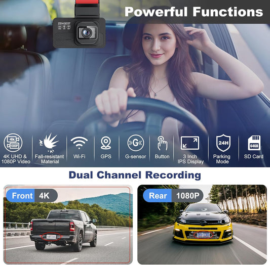 Dash Cam Front and Rear, 4K+1080P FHD Dual Dash Cam with ADAS, GPS, 5G WiFi & App Control, 64GB Card Included, G-Sensor, Night Vision, Loop Recording, 170°Wide Angle, WDR, 24H Parking Mode